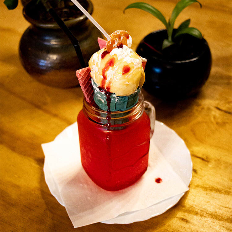 Ingredients: Jelly, ice, soda, sherbet syrup, cream, wafers, ice cream cone, ice cream, sherbet powder, and SHOTT Beverages Raspberry syrup drizzle.