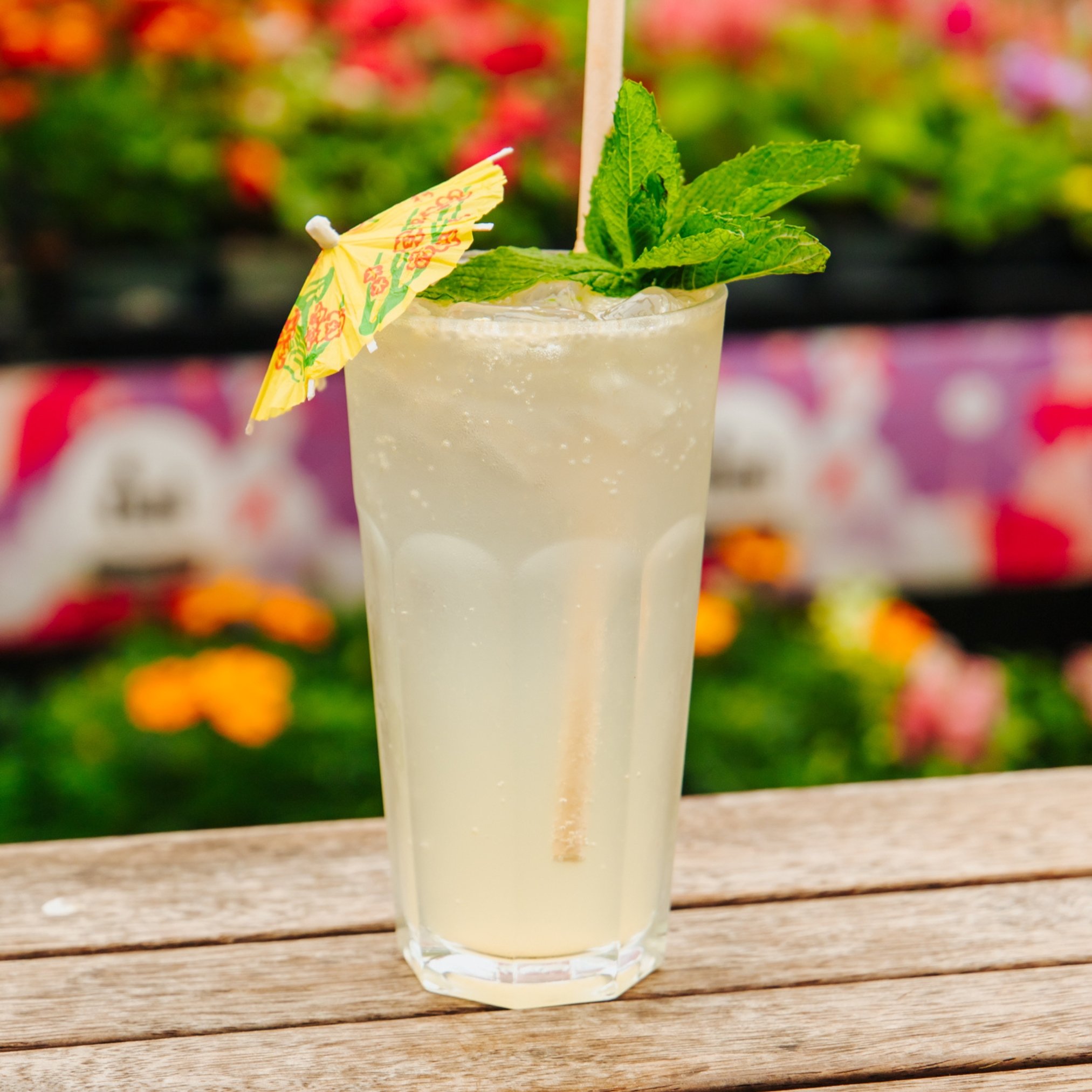 A refreshing Apple Feijoa Spritzer over ice garnished with candied mint leaf, fresh lemon and a tropical cocktail umbrella.