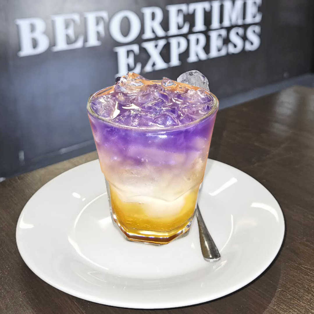 This vibrant drink features a base of butterfly pea, with juicy chunks of nata de coco and pineapple,