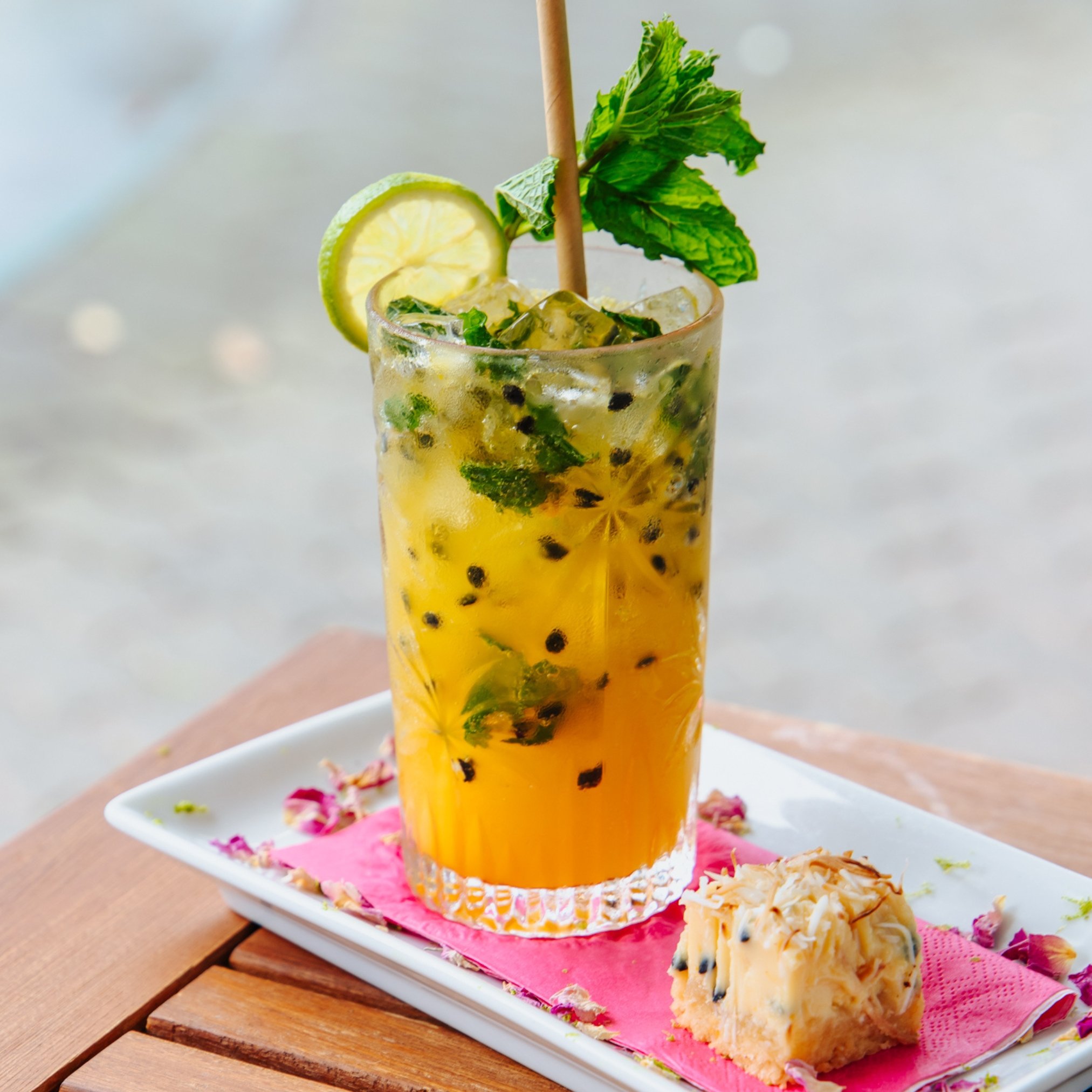 Ingredients: Double shot vodka, single shot blue Curacao, Calypso blue lemonade, simple sugar syrup, lime juice, blue sugar popping candy rim, raspberries, mint leaf, edible glitter served with a lollie pop. (Non alcoholic version available)